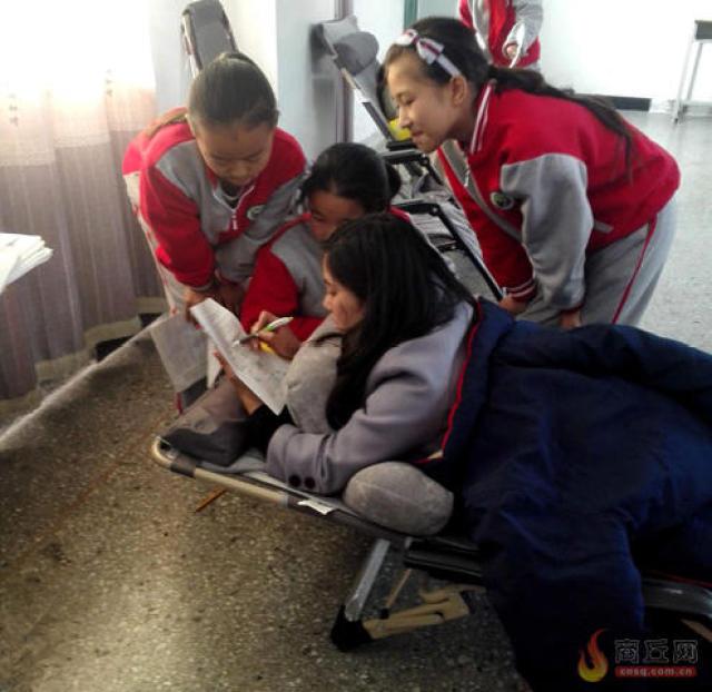 郝晶晶老师趴在折叠床上为学生讲解试卷
