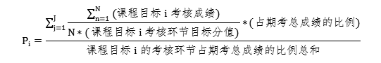 按照课程教学大纲,针对每个课程目标对应的考核环节,分别求得对应考核结果的平均分,再根据下列公式计算出第i个课程目标的达成评价值Pi(课程目标i共有J个考核环节):