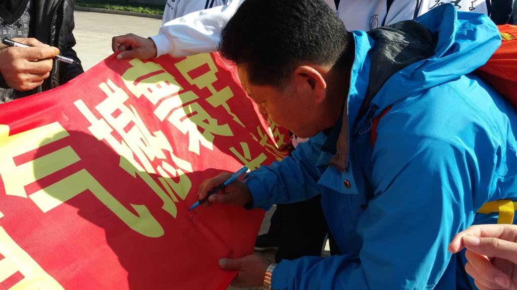 同学们分组进行签字,并邀请路人在条幅上签字,以表弘扬长征精神,铭记红色历史的决心。