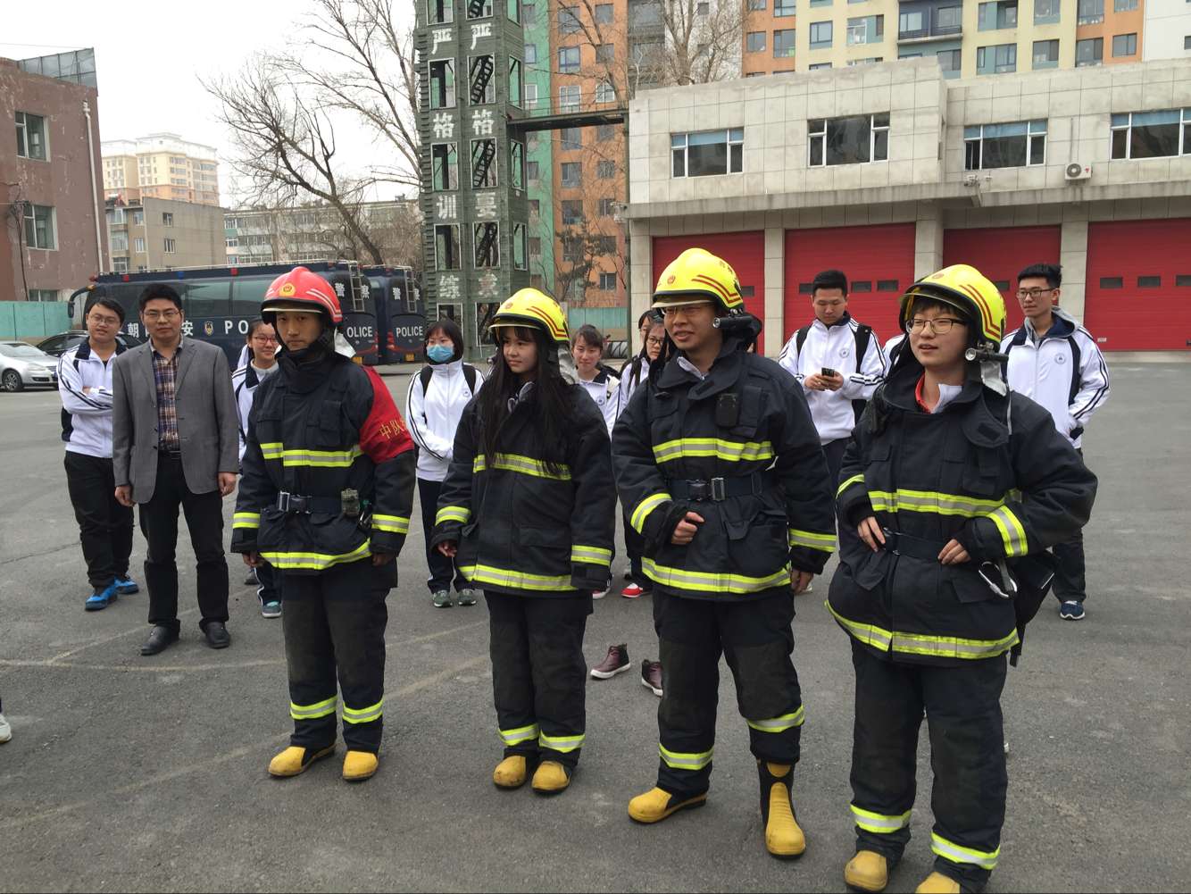 在消防支队负责人的指引下,同学们亲自穿上防火服,并体验使用各项消防器材。最后,合影留念。