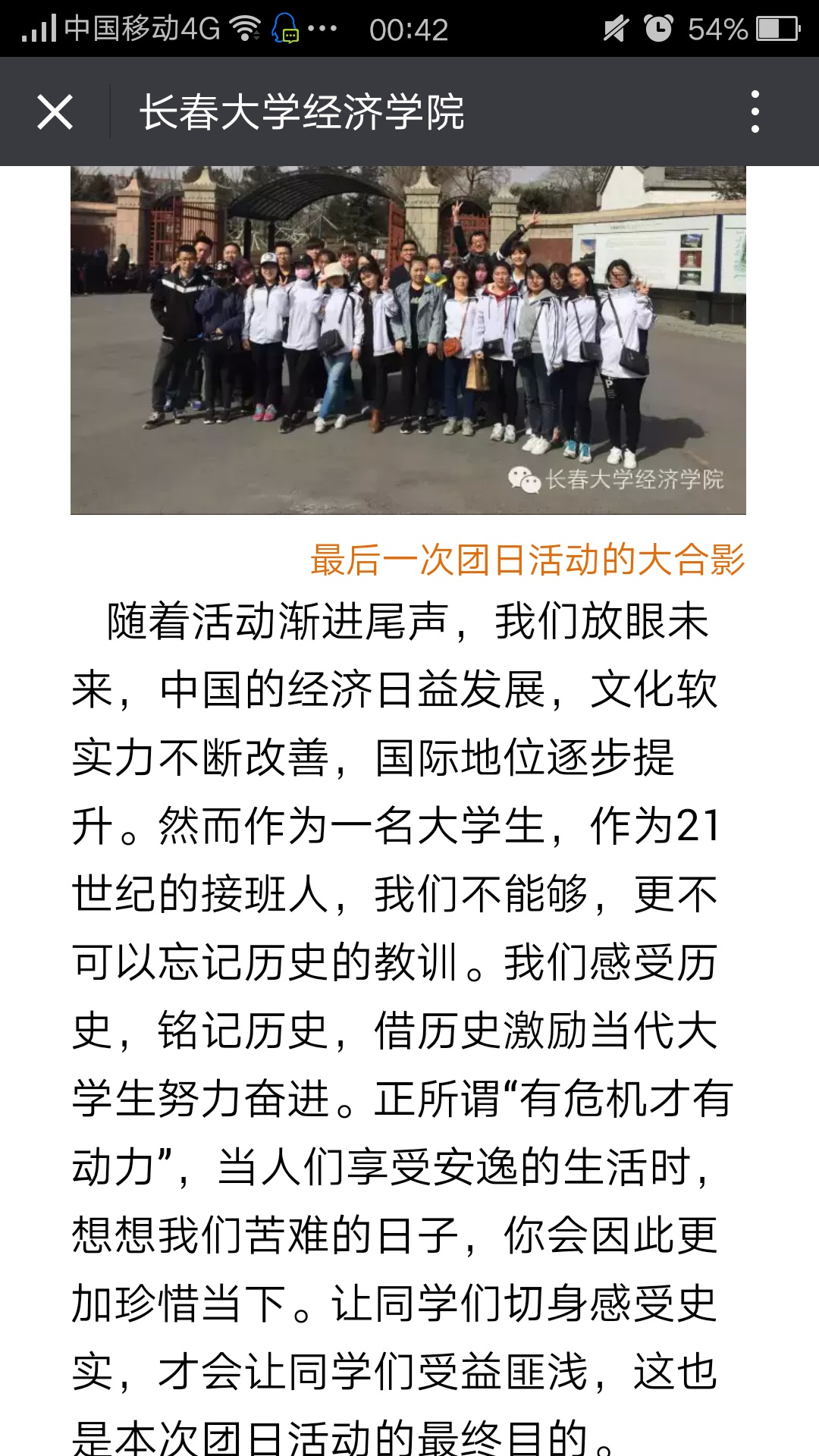 此次团日活动完成后,同学们对历史有了新的认识。作为大学生需要对祖国的未来负责,感受历史,懂得落后就要挨打的道理。当人们享受安逸的生活时,也要想到曾经的挫折,有危机感才会有动力,珍惜当下,努力奋进。