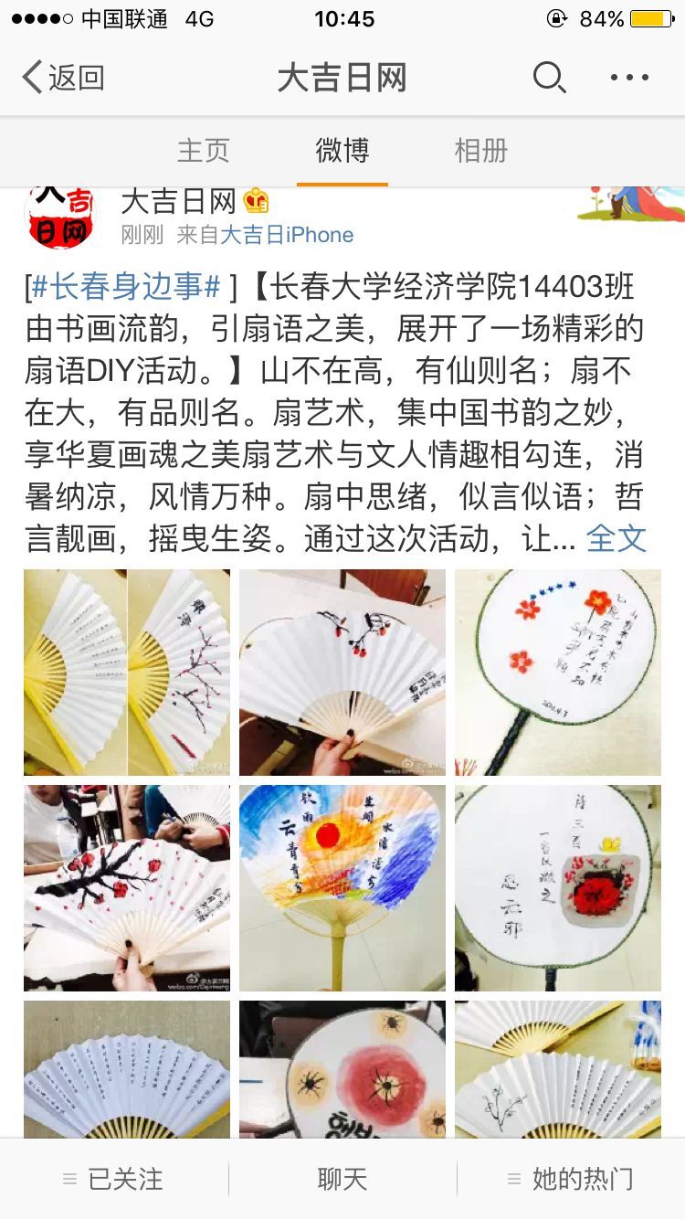 2016年4月7日,必赢3003no1线路检测中心14403团支部在长春大学综合楼A区进行了“弘扬正能量,清凉扇语DIY”主题团日活动。本是纳凉之物的扇子,随着时代的发展而逐渐悄然退出现代人的生活,但其作为艺术品的功能却越来越得到凸显,执摇把玩间流露出浓郁的文雅玲珑之气。