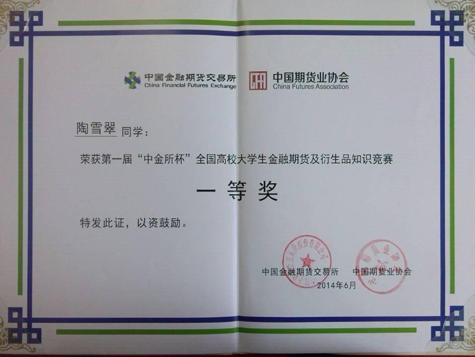 陶雪翠同学荣获第一届“中金所杯”全国高校大学生金融期货及衍生品知识竞赛一等奖 |