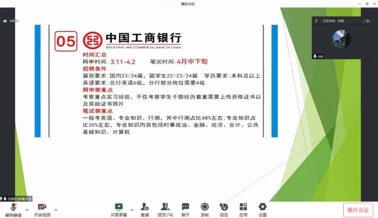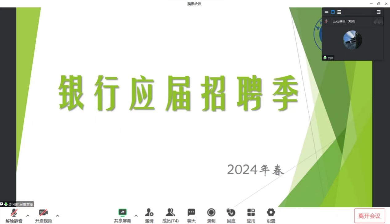 刘刚老师从银行等金融机构的工作内容、发展前景、招聘要求等三个方面开展介绍,并以自己的亲身经历和行业内同事的经历分享了职业规划感悟,建议想要进入银行工作的学生“广撒网,多敛鱼,择优而从之”,在实战中不断提高自身竞争力。